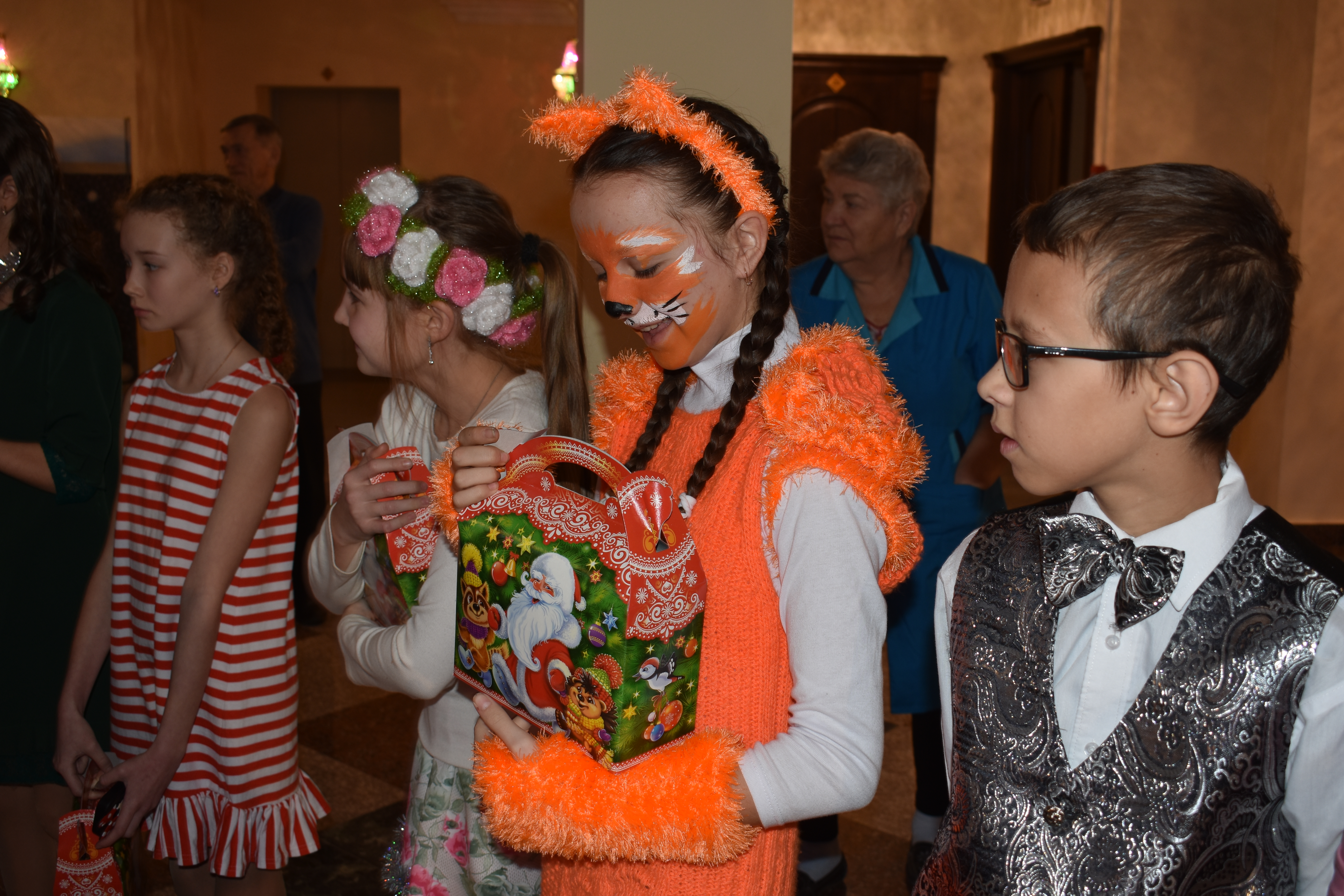 А затем маленькие гости праздника получили новогодние подарки, и сколько же восторга было у ребят, сколько впечатлений! Они обсуждали содержимое своих коробочек со сладостями и фотографировались с ними, а мамы и папы, наблюдая за своими детьми, улыбались и переглядывались с остальными родителями. Дети подбегали к сказочным персонажам и просили сделать фото на память, причем не только у елки, но и в красивых фотозонах, устроенных сотрудниками Театра кукол.