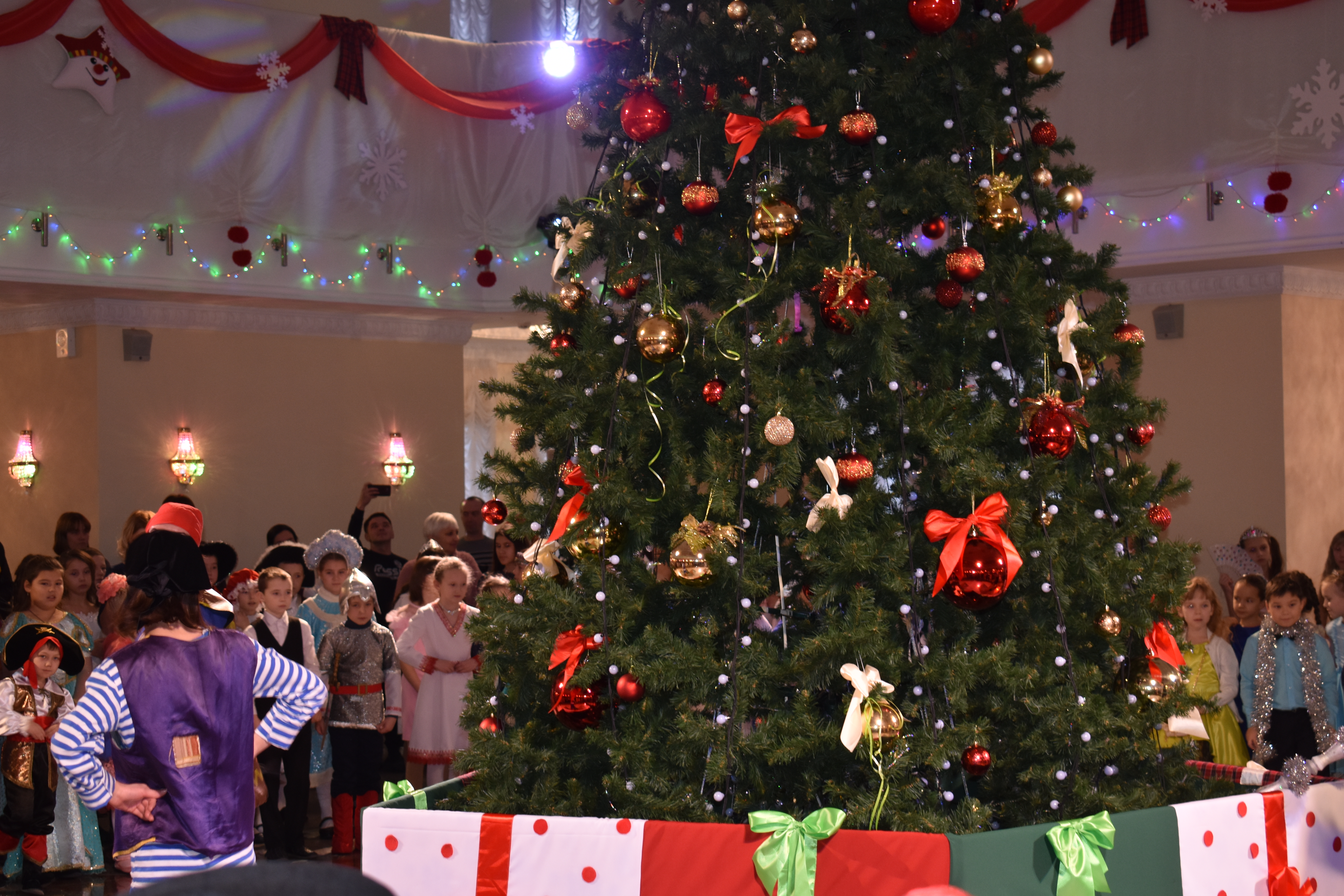 Ровно в 10.00 к ребятам обратился сказочный Трубочист, поздравив всех с наступающим Новым годом. В компании с двумя черными воронами он развлекал детей, пока вдруг не явилась Снежная королева, зловеще звеня льдинками. Чтобы помешать ей испортить праздник, мальчики и девочки выполняли игровые задания, танцевали разбойничий танец вместе с пиратами, пели, хлопали в ладоши и топали, водили хоровод со Снегурочкой и спасли Деда Мороза, которого заколдовала Королева и прогнали злую колдунью.