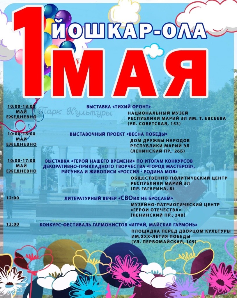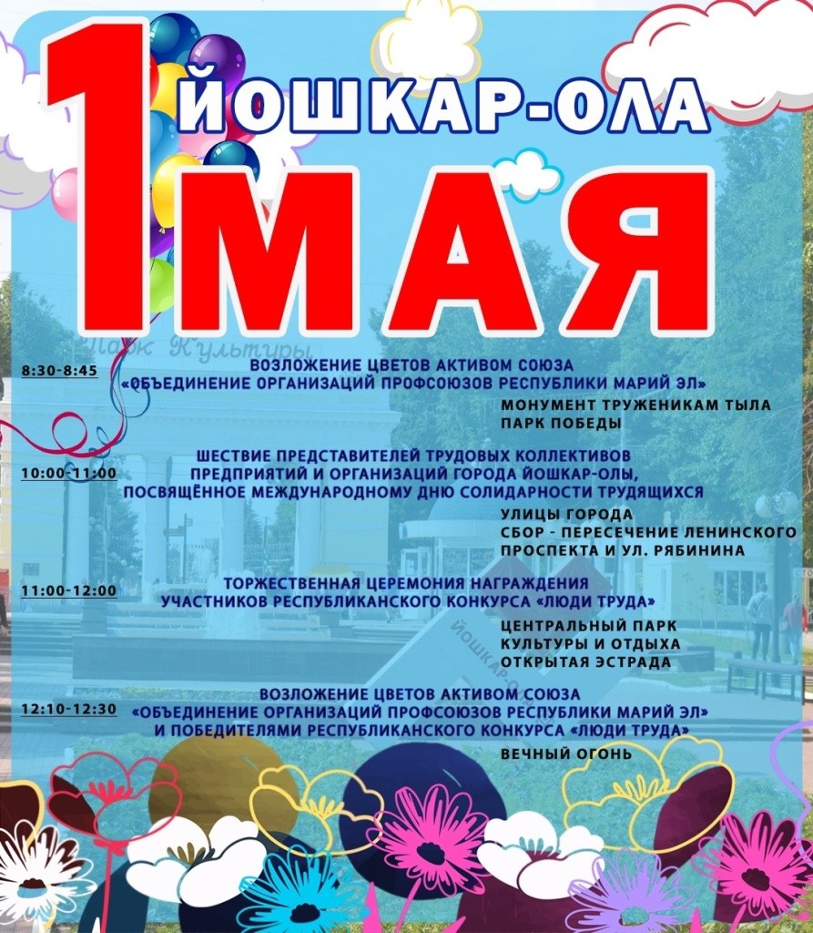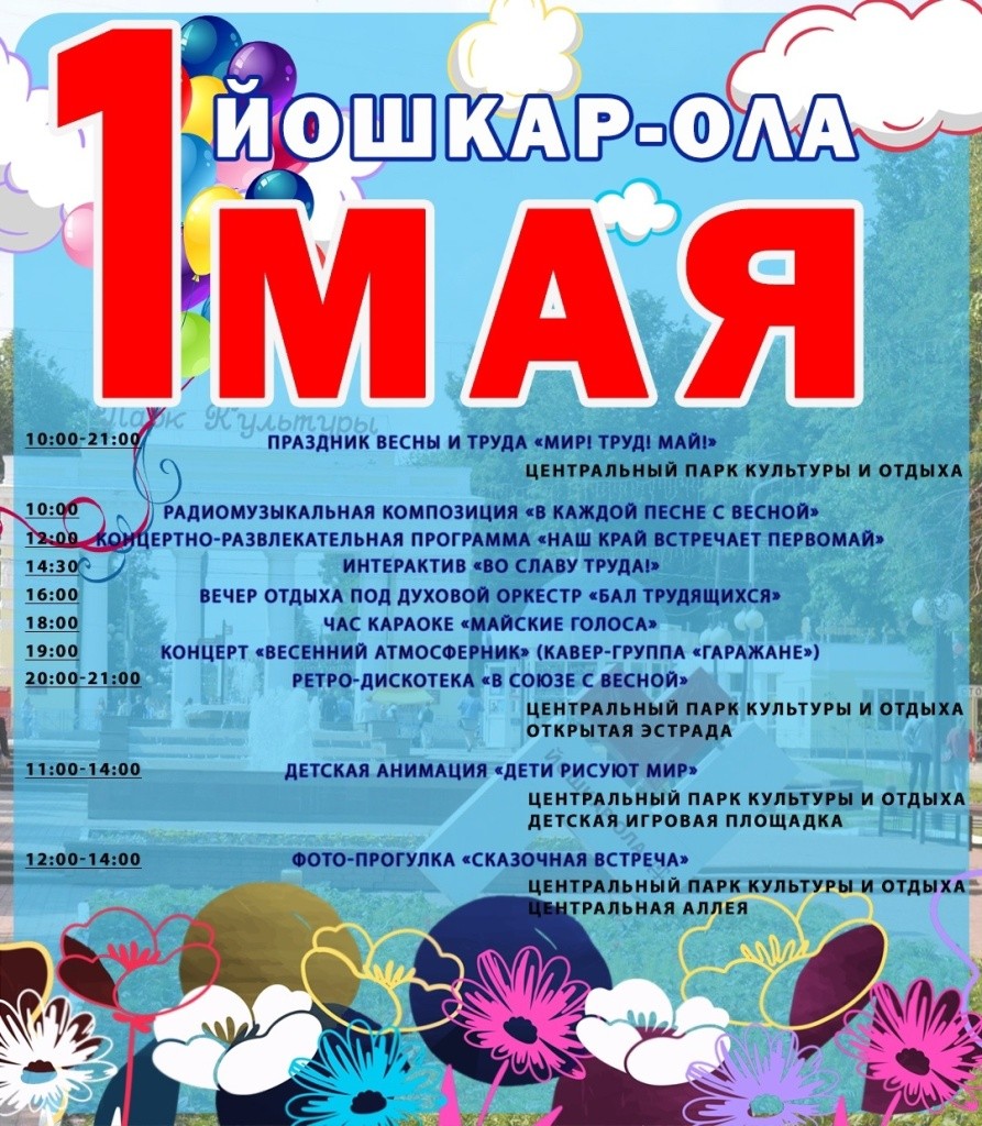 10:00-11:00 ‒ шествие представителей трудовых коллективов предприятий и организаций города Йошкар-Олы, посвящённое Международному дню солидарности трудящихся (улицы города, сбор на пересечении Ленинского проспекта и улицы Рябинина).
