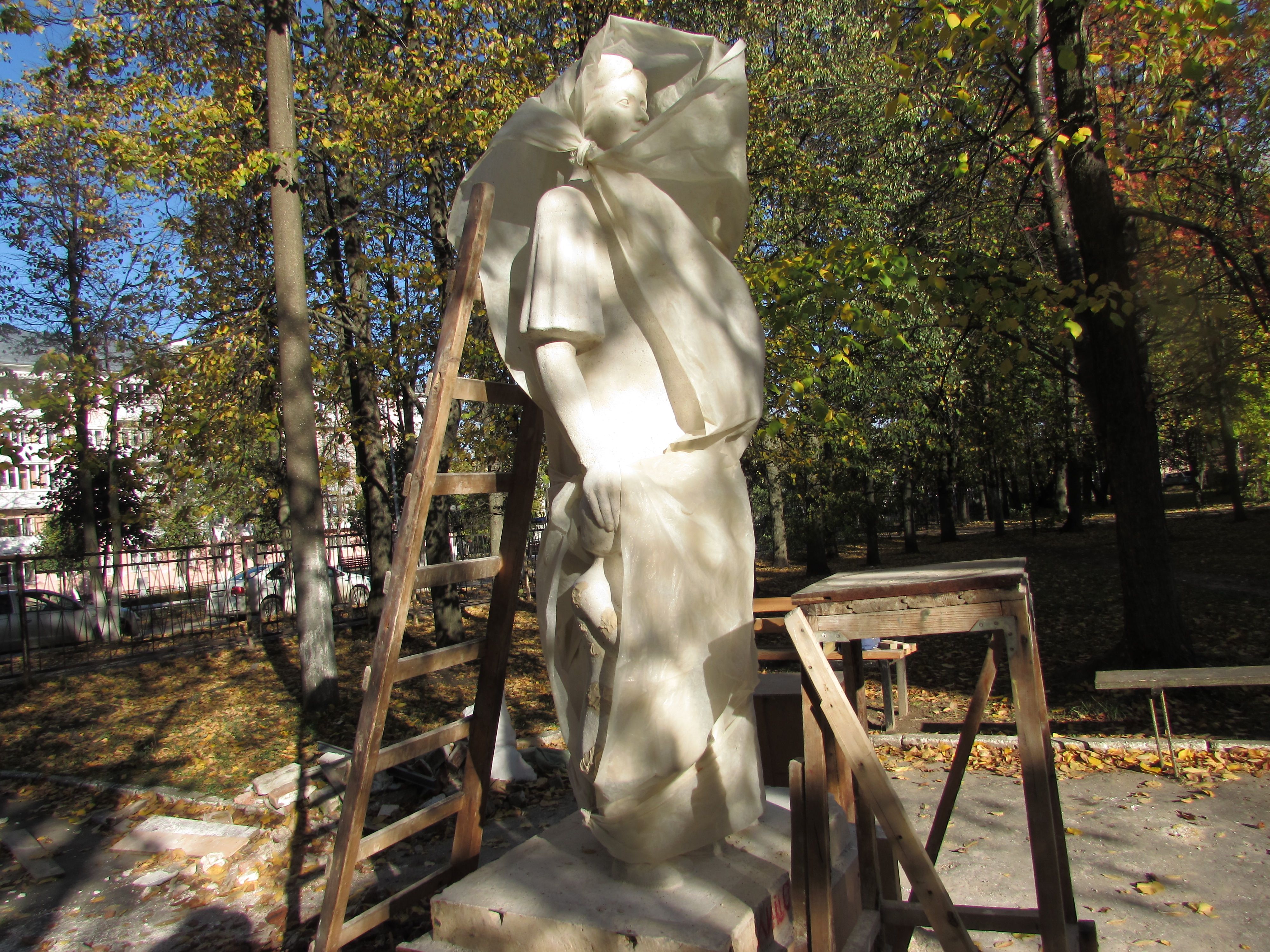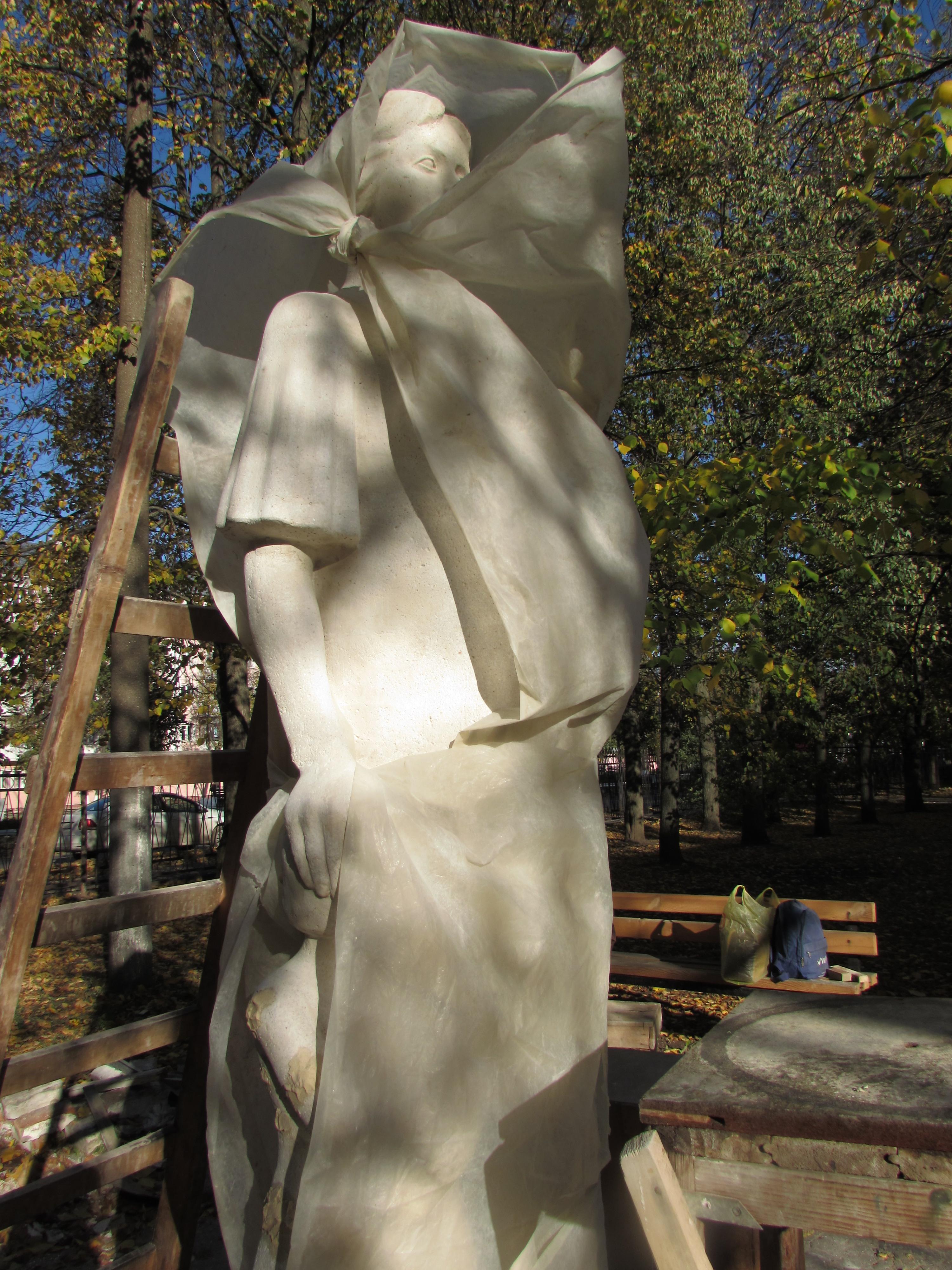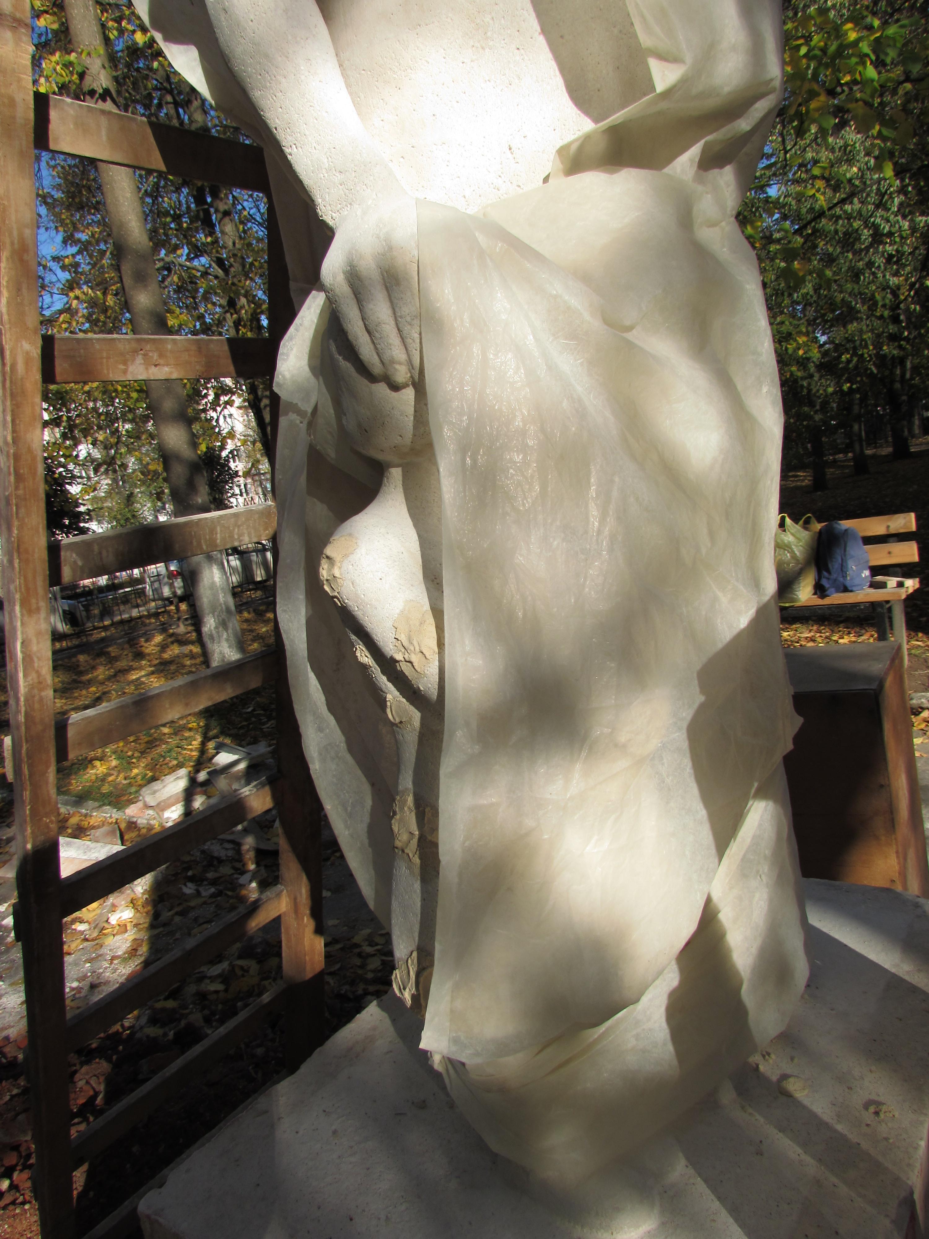 Вероятно, любопытные горожане неоднократно пытались заглянуть под пленку, скрывающую статую. Местами она приоткрыта, и уже сейчас можно в общих чертах представить, как будет выглядеть будущая статуя женщины с ребенком, олицетворяющая материнство?