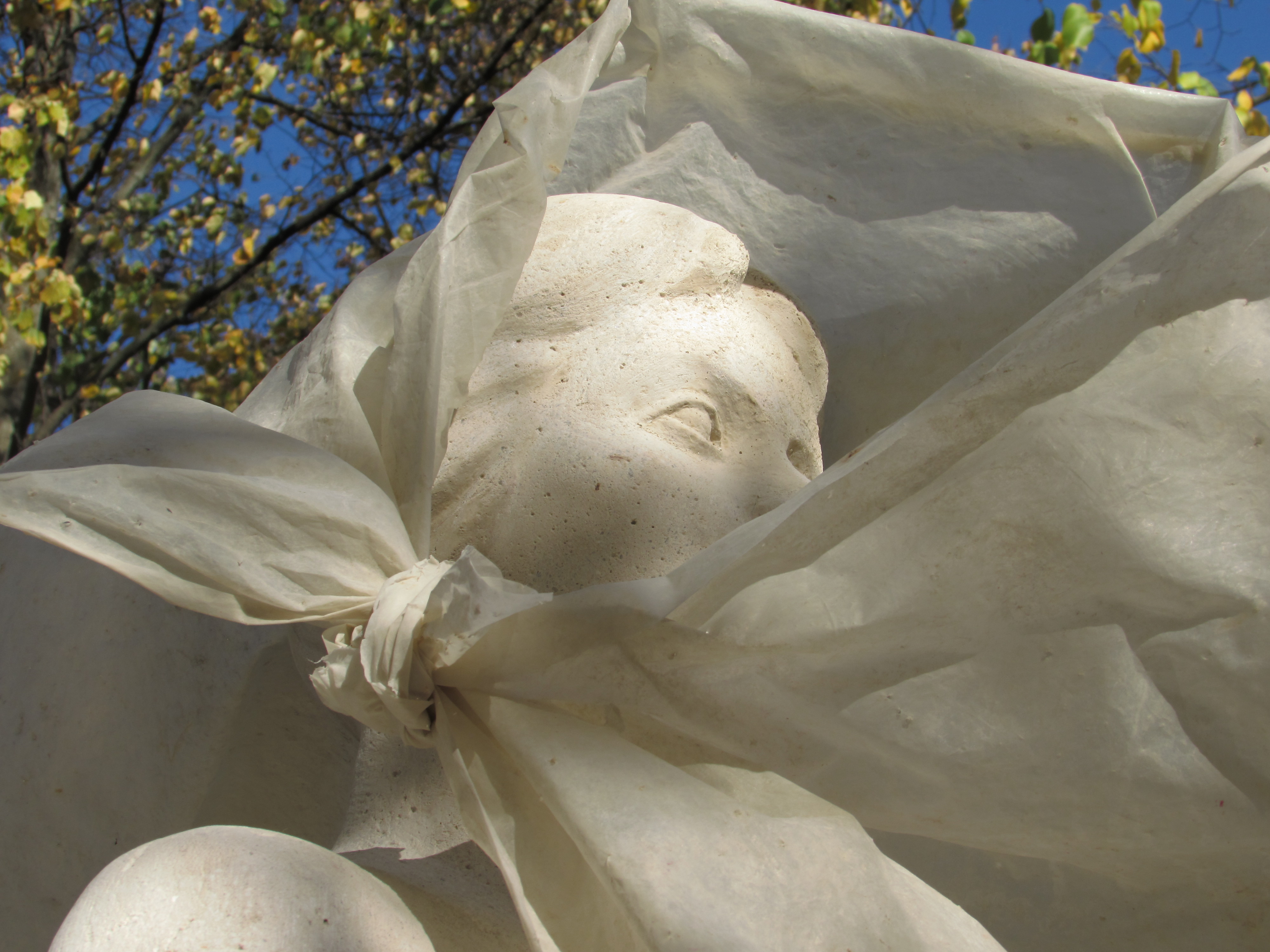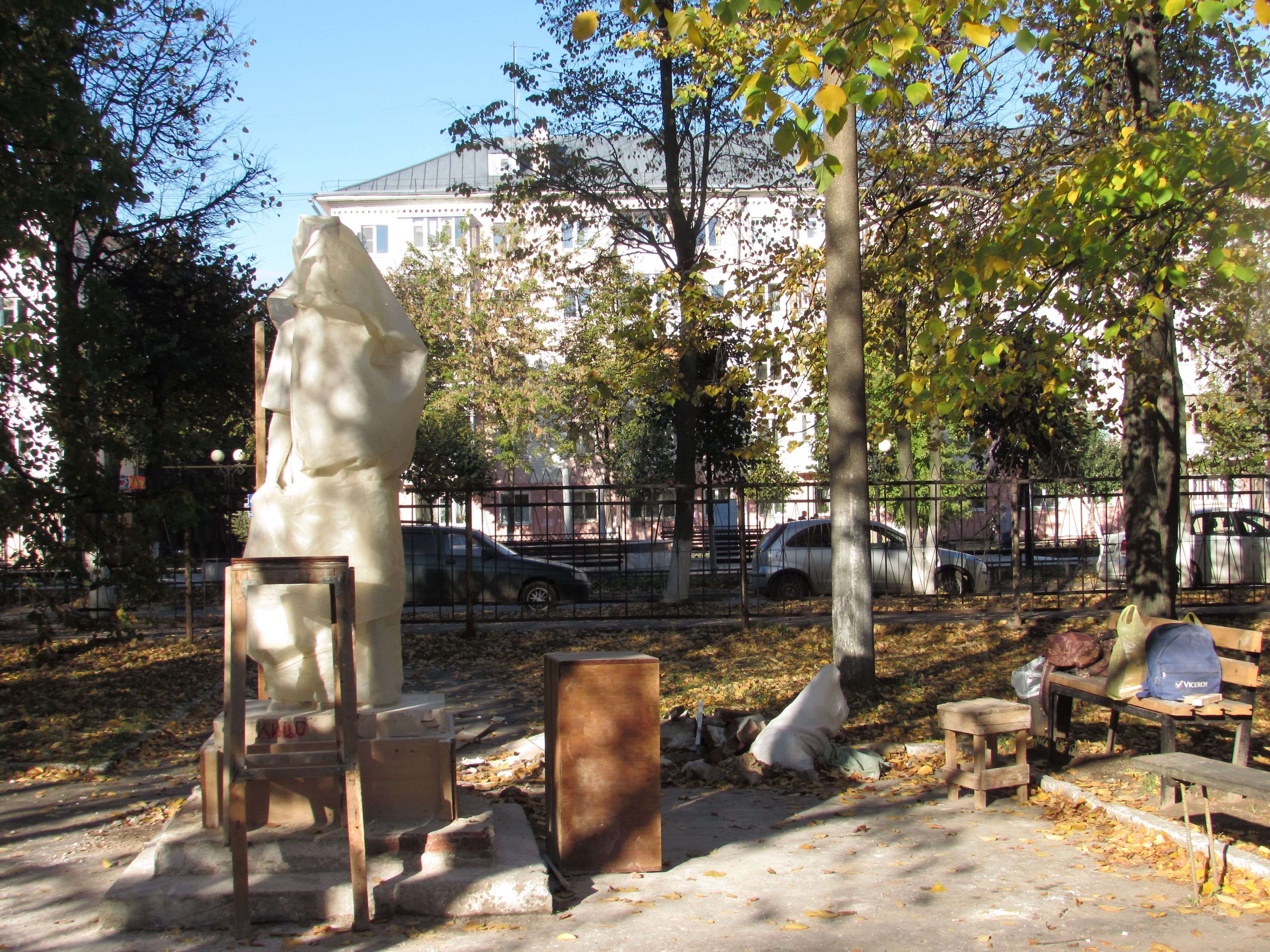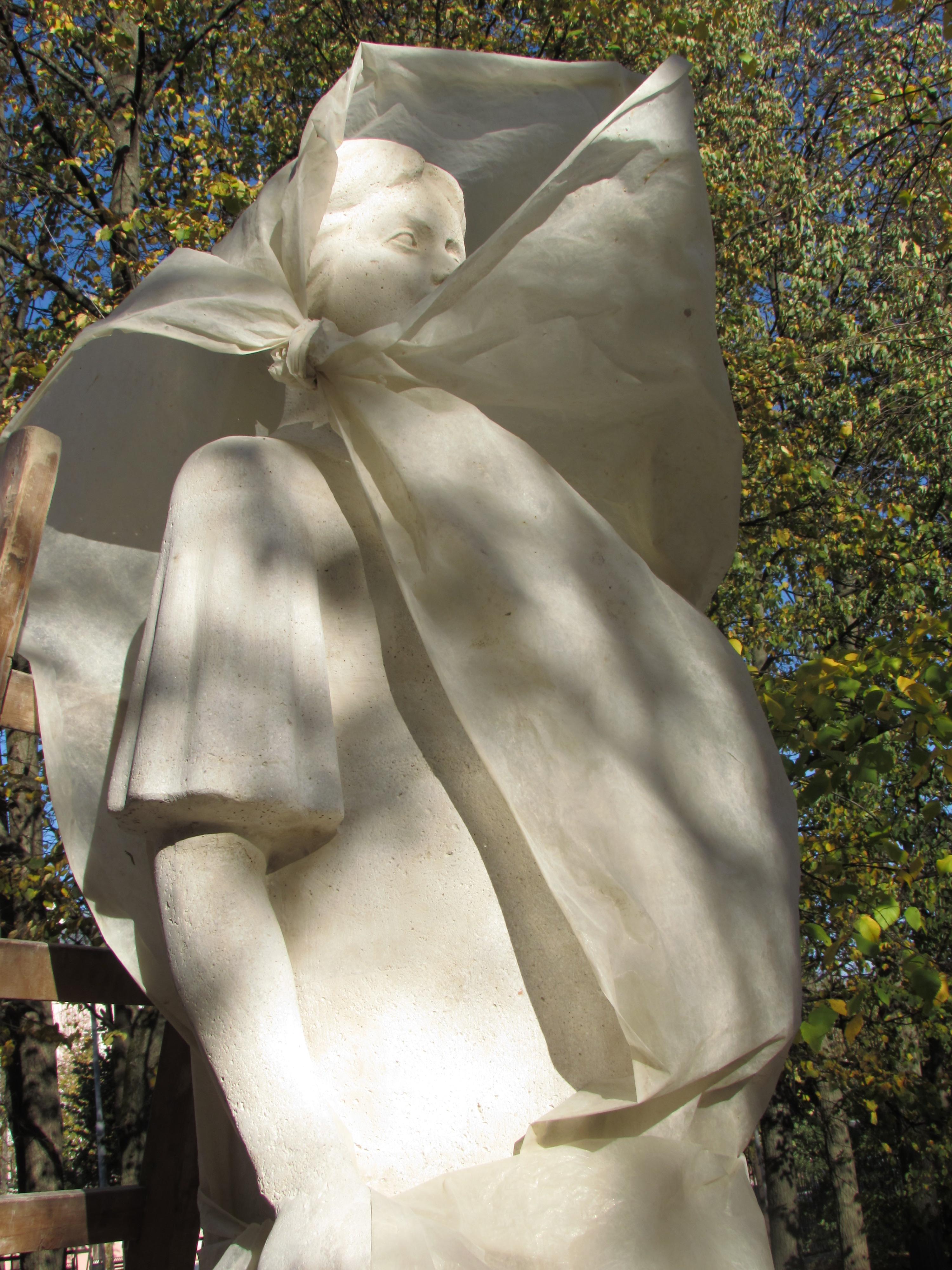 Вероятно, любопытные горожане неоднократно пытались заглянуть под пленку, скрывающую статую. Местами она приоткрыта, и уже сейчас можно в общих чертах представить, как будет выглядеть будущая статуя женщины с ребенком, олицетворяющая материнство?