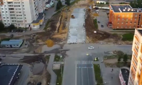 В группе мэрии Йошкар-Олы в ВК появилось видео, на котором видно, как с высоты птичьего полёта особенно отчетливо уже просматриваются очертания будущего участка дороги и тротуара.