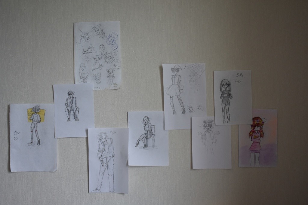 Училась Саша, в основном, по видео на YouTube, вдохновением служат музыка и компьютерные игры. Сначала ей нравилось изображать животных и роботов, сейчас куда интереснее рисовать людей.