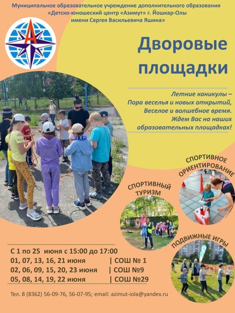 В Йошкар-Оле открыт городской проект «Вместе! Летом! Всем двором!». В каникулы ребята могут провести время максимально полезно и интересно. Так, с 1 по 25 июня у школ № 1, № 9 и № 29 пройдут занятия в компании специалистов детско-юношеского центра «Азимут». Занятия организованы с понедельника по четверг с 15.00 до 17.00.
