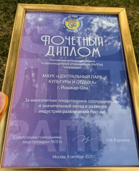 «Особая гордость ‒ наш парк стал первым, вступившим в Российскую ассоциацию парков и производителей аттракционов. На 46-й Международной выставке аттракционов вице‑президент ассоциации Игорь Родионов вручил директору парка Ивану Конышеву почётный диплом за многолетнее сотрудничество и значимый вклад в развитие индустрии развлечений в России. Это признание ‒ важная победа для всей команды парка и для всего города», - отметил Антон Трудинов в соцсетях и поблагодарил работников парка за труд.