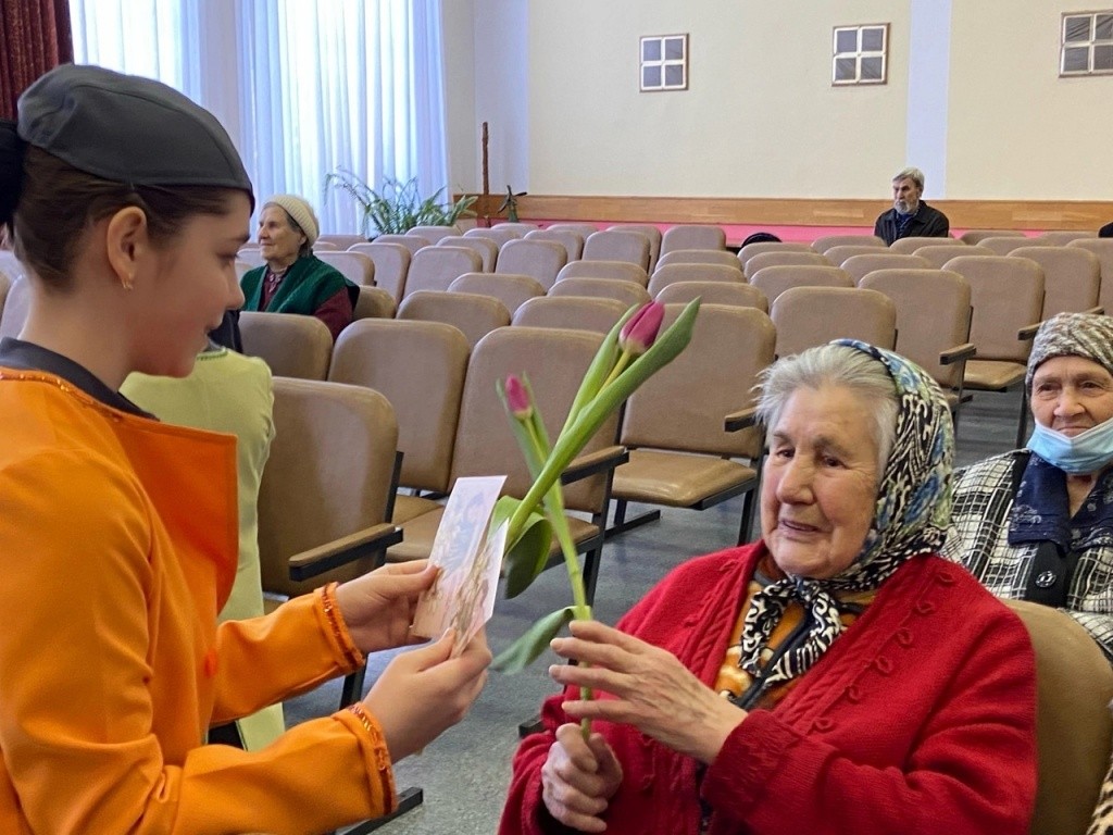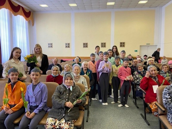 Во время встречи с пожилыми людьми ребята вручили им праздничные открытки и провели концерт, пообещав приехать снова.