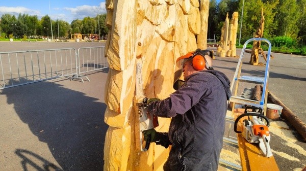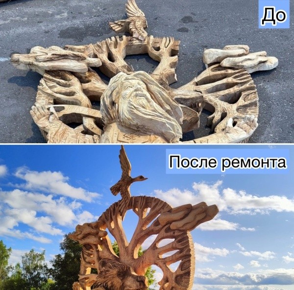 Композиция упала из-за сильного ветра и получила повреждения, несмотря на изначально закреплённый фундамент. Теперь скульптуре вернули прежнее величие и укрепили дополнительно, сообщает администрация города. Также резчики дорабатывают фигуры, которые стали финальными работами в испытании по скоростной резьбе.
