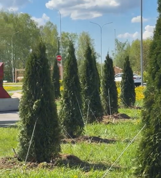 Накануне озеленители готовили посадочные ямы, а уже сегодня, 13 мая, с самого утра началась высадка крупномеров – зеленых туй – в Марий парке.
