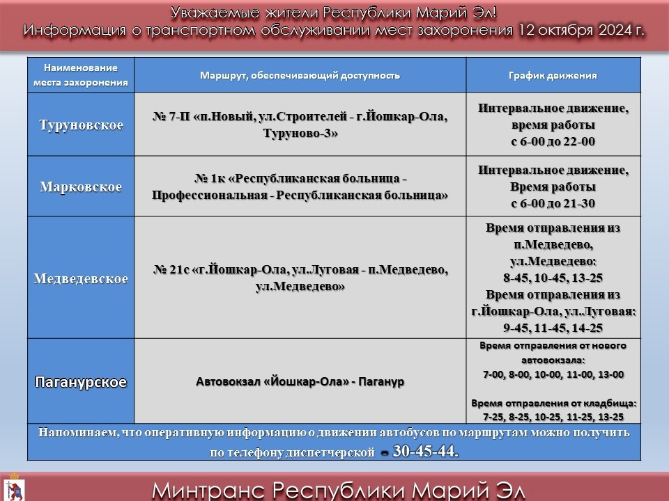 На Туруновское кладбище с 6:00 до 22:00 ходит автобус № 7П. На Марковское кладбище с 6:00 до 21:30 - автобус № 1к. На Медведевское кладбище ездит автобус № 21к (из пгт Медведево с одноименной улицы он выезжает в 8:45, 10:45, 13:25, из Йошкар-Олы - в 9:45, 11:45, 14:25). Автобус «Паганур – Йошкар-Ола» отправится с центрального автовокзала Йошкар-Олы в 7:00, 8:00, 10:00, 11:00, 13:00. Обратно - в 7:25, 8:25, 10:25, 11:25, 13:25.