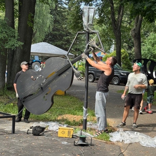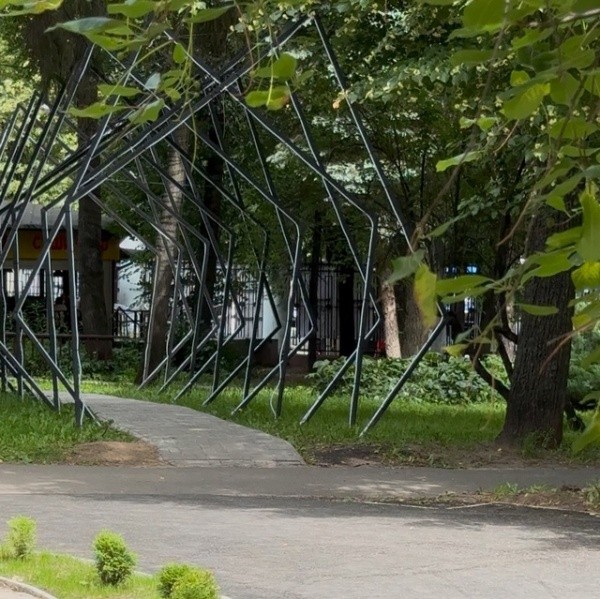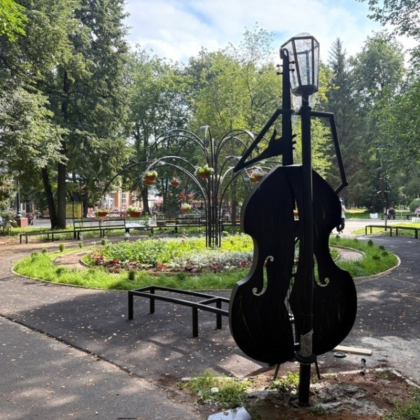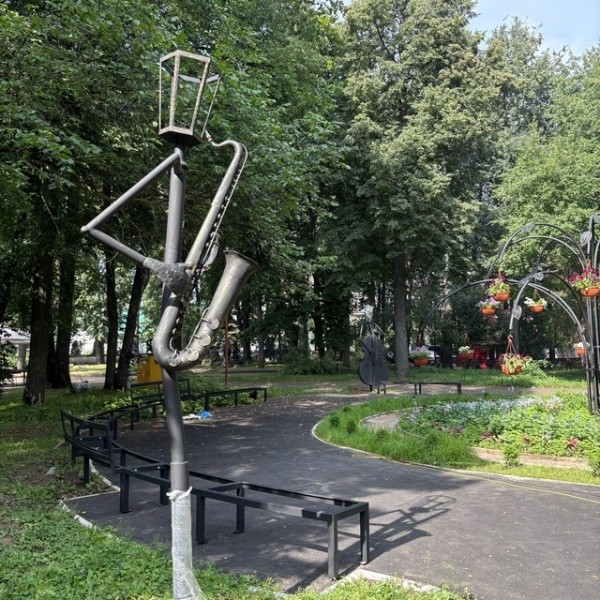 Мастера уже приступили к работе. Около клумбы устанавливают фигурные лавочки, которые станут идеальным местом для отдыха и фотосессий. А еще - фонари в виде музыкантов с саксофоном и контрабасом. Также вдоль прогулочной зоны уже появилась необычной формы арка.