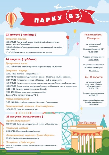 В праздничной программе заявлены концерты, дискотека, фотопрогулка с ростовыми куклами, показ фильма «Сто лет тому вперед» (12+) под открытым небом, интерактивы и светомузыкальное шоу.А сегодня в Центральном парке культуры и отдыха пройдут мероприятия, посвященные Дню Государственного флага России.