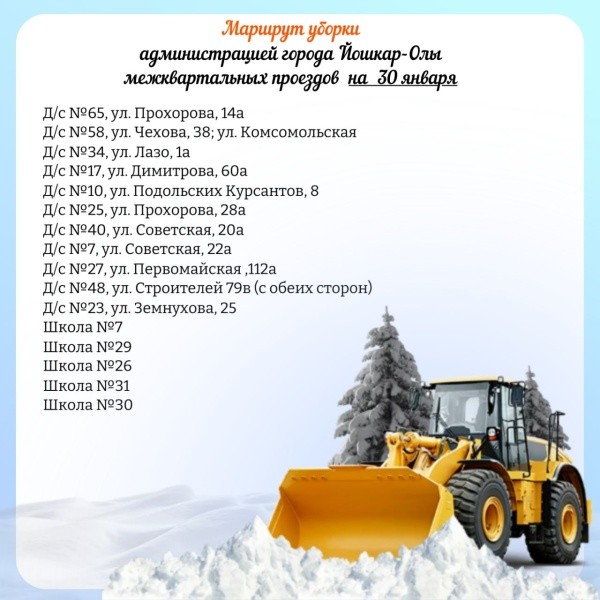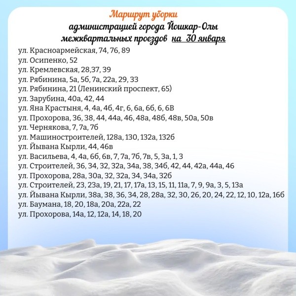 В мэрии Йошкар-Олы опубликовали планируемый маршрут движения снегоуборочной техники по расчистке межквартальных проездов на завтра, 30 января.