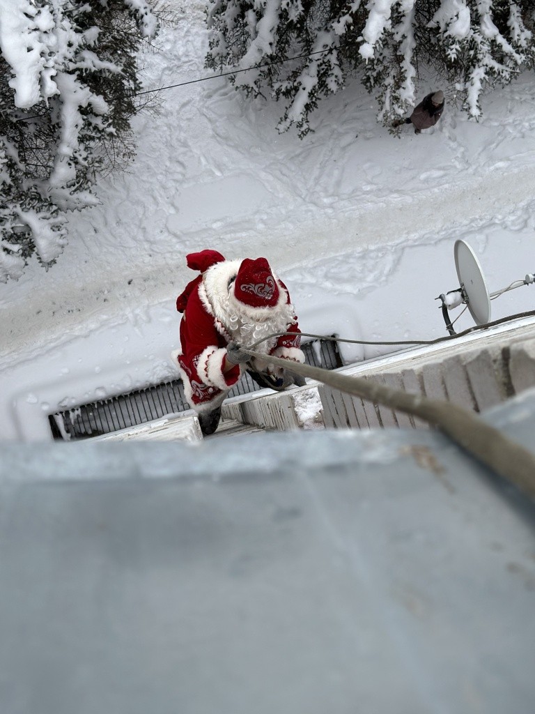Со стороны выход спасателя в костюме Деда Мороза выглядит очень эффектно. С крыши больницы опускают веревку, на ней и будет затем держаться волшебный гость. Он одет в страховочную привязь, в которую встегнут карабин со спусковым устройством, его он затем незаметно от детей отцепит и зайдет в окно. Если учесть, что все это делается на высоте примерно в 12 метров, а основная опора находится на самом здании, то задание у спасателя как в фильмах про Джеймса Бонда. Но сотрудникам МАСС все по плечу, тем более, что подобные тренировки у них проходят часто, ведь их учат промышленному альпинизму.