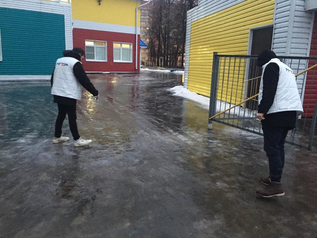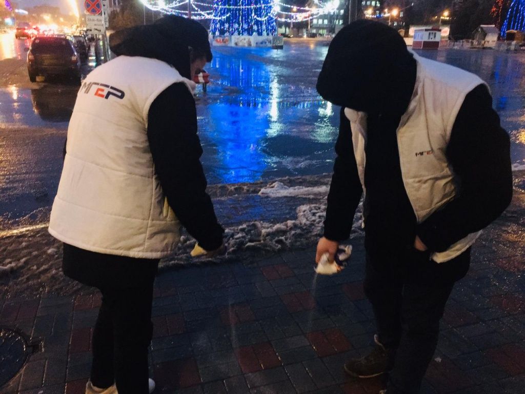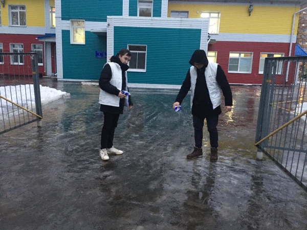 Сегодня молодые люди выехали по пяти адресам и покрыли дорожки, где было опасно ходить, солью.