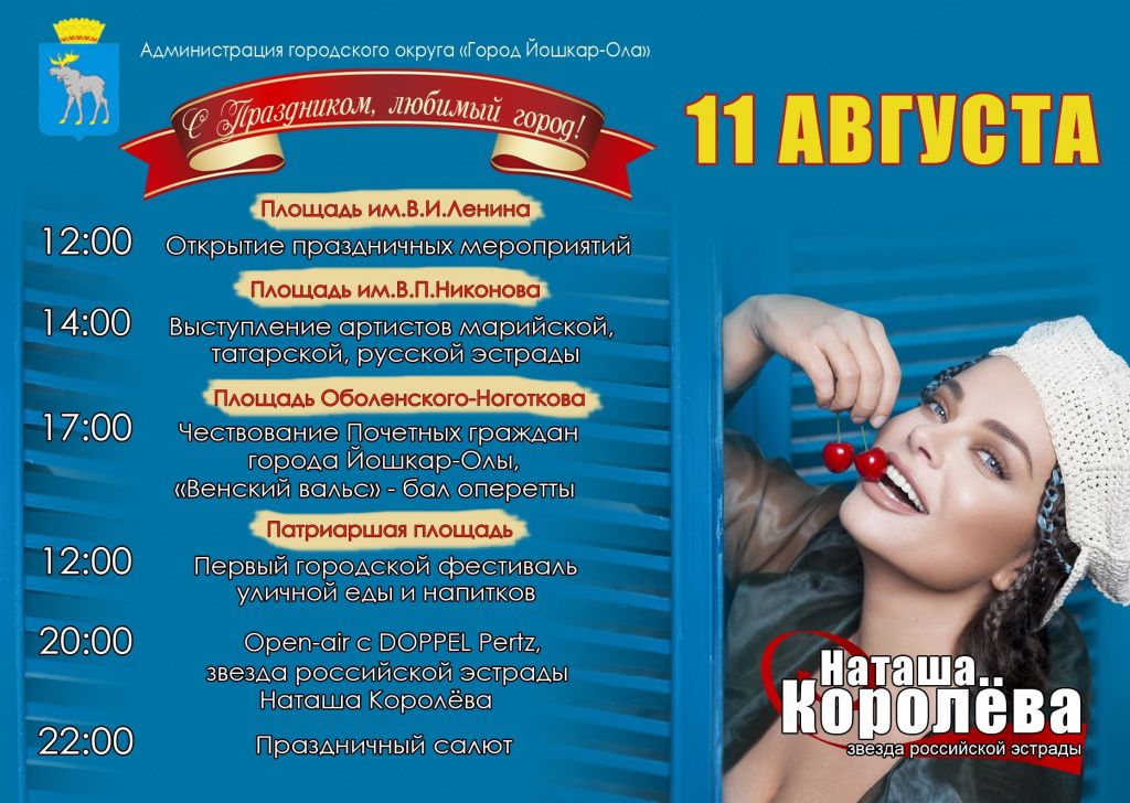 Концерт известной певицы Наташи Королевой начнется ровно в 20 часов. И по традиции в конце дня йошкаролинцев и гостей столицы ждет праздничный салют.