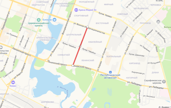 15 и 16 мая с 8:00 до 19:00 будет перекрыт участок от Ленинского проспекта до улицы Воинов-Интернационалистов, сообщили в администрации Йошкар-Олы.