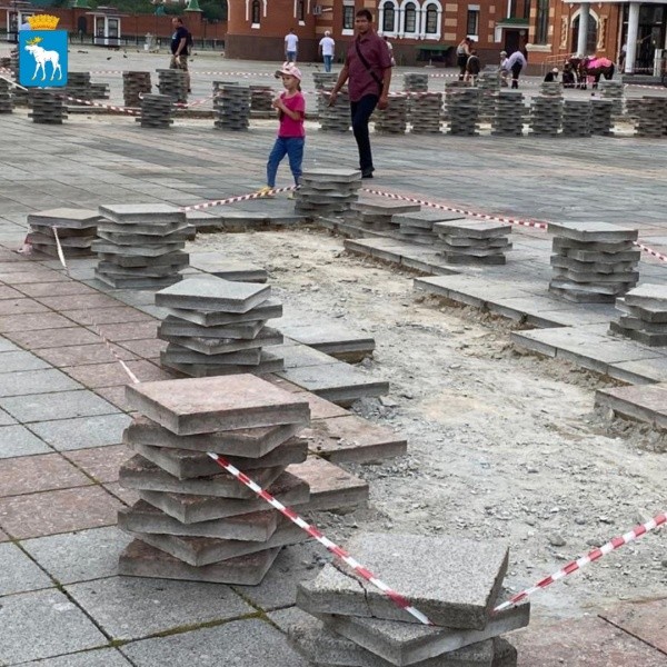 На Патриаршей площади, площади Республики и Пресвятой Девы Марии ведутся ремонтные работы. Подрядчик разбирает поврежденные участки, чтобы устранить недостатки и заложить новую плитку.