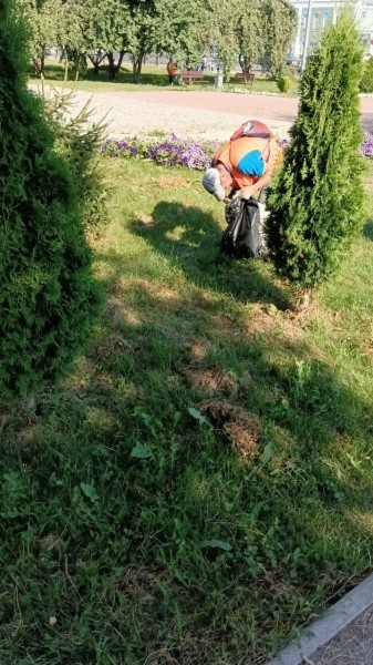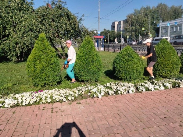 В сквере недалеко от Вознесенской церкви убрали мусор и постригли туи.