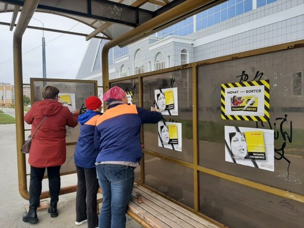 Работницы МУП «Город», выйдя сегодня, 16 сентября, на работу, получили задание: устранить безобразие, появившееся на новой обстановке общественного транспорта. Павильон был обклеен листовками с предвыборной агитацией.
