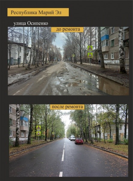 Например в этом году, в Йошкар-Оле отремонтировали улицу Осипенко. Важная городская артерия позволяет комфортно добираться к детскому саду №35, школе №2 и МарГУ. Помимо этого, улица ведет сразу к нескольким медицинским учреждениям: