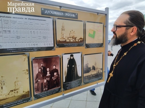 Далее знакомимся с жизнью дореволюционного Царевококшайска. Каждый стенд имеет свое название: «Истоки», где рассказывается об истории возникновения крепости и города, «Торговля», «Лечебное дело», «Духовная жизнь», «Правопорядок» и другие. Здесь, кроме документов, представлены фотографии известных личностей Царевококшайска и служащих различных ведомств, отдых горожан, городская архитектура. Конечно, каждый из приглашенных на презентацию первым делом стал изучать отделы экспозиции своего ведомства. К примеру, секретарь епархии Дмитрий Дьяков сразу подошел к стенду «Духовная жизнь».