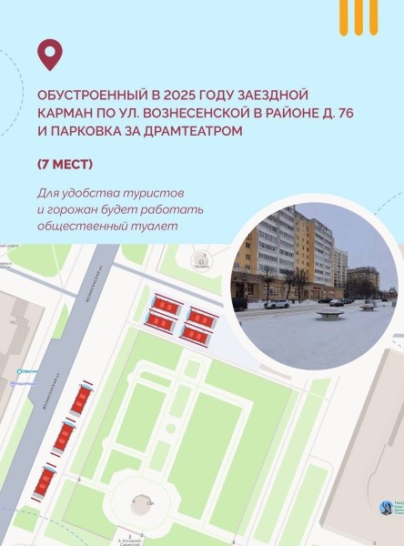 Обустроенный в 2025 году заездной карман по ул. Вознесенской в районе д. 76 и парковка за Драмтеатром – 7 мест. Кроме того, для удобства горожан и туристов уже в ближайшее время здесь будет введен в эксплуатацию общественный туалет.