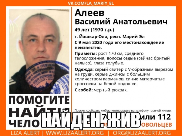 В Йошкар-Оле найден ранее пропавший 49-летний Василий Алеев. Об этом сообщили в паблике Вконтакте Поискового отряда Лиза Алерт Марий Эл.
