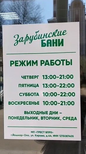 «Зарубинский бани» открылись сегодня 29 апреля в 10:00. Любителей легкого пара ждут с четверга по воскресенье согласно расписанию. Понедельник, вторник и среда – выходные дни.
