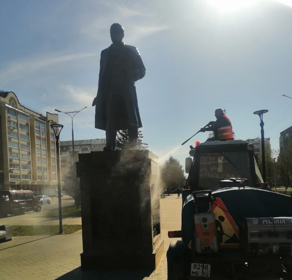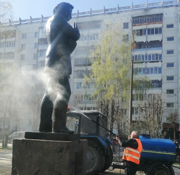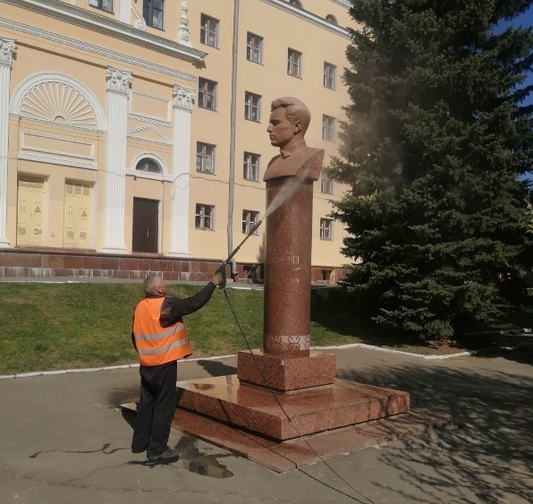Сотрудники МУП «Город» отмывают от пыли и грязи монументы в Йошкар-Оле.