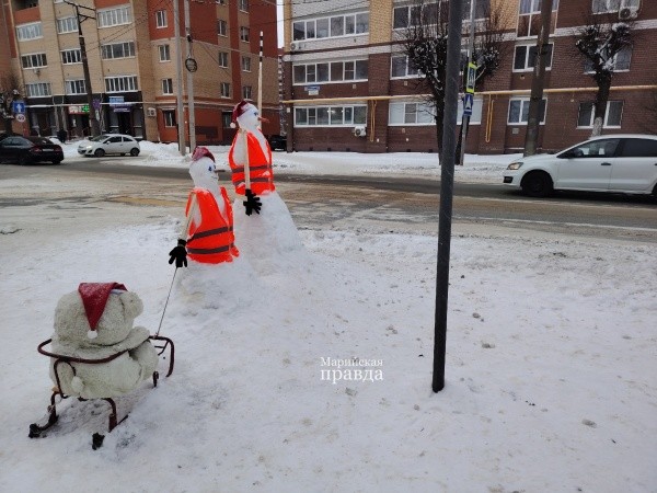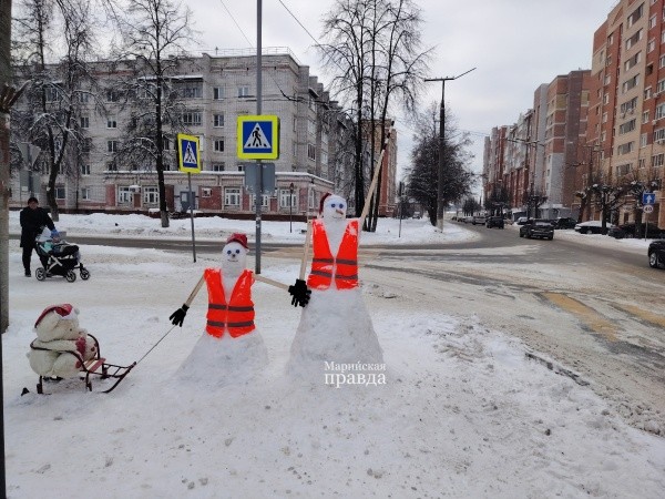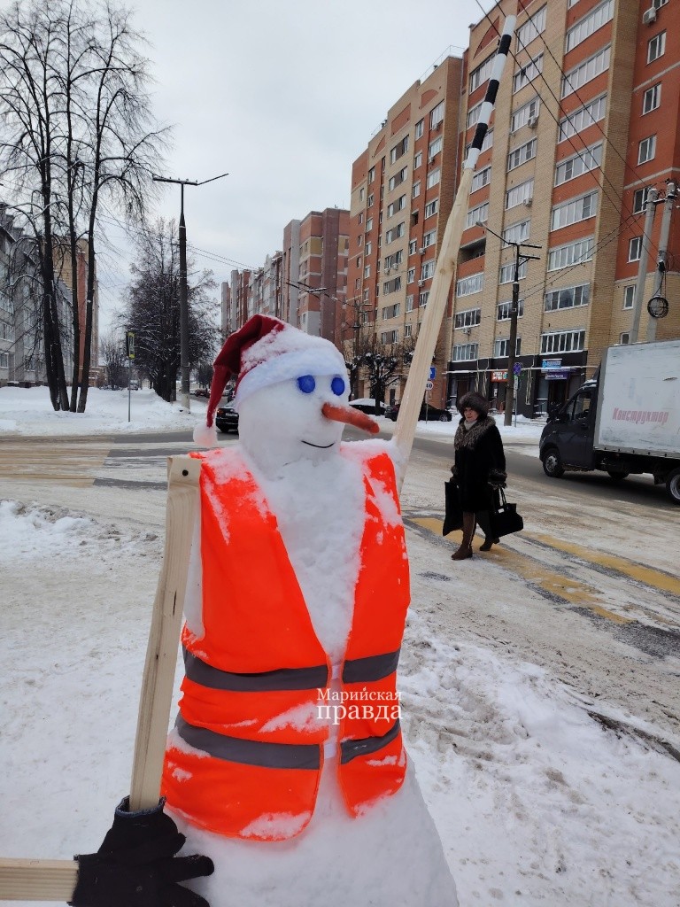 Уже не первый год в Йошкар-Оле на перекрестке улиц Анциферова и Зарубина появляется необычная снежная инсталляция, предупреждающая водителей о необходимости притормозить возле пешеходного перехода.