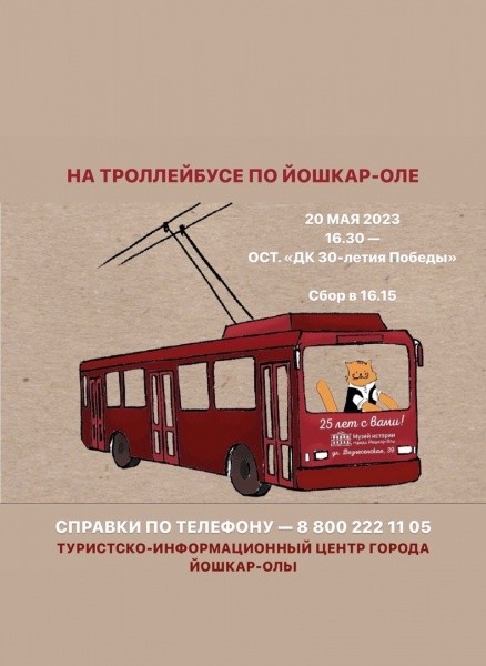 Сейчас открыта запись на вторую экскурсию 20 мая в 16.30.  Маршрут начнется с остановки "Мир тканей" (по стороне улицы Первомайской в сторону улицы Красноармейской) у Дворца культуры им. ХХХ-летия Победы. Троллейбус проедет по центральной, исторической части города, через набережную по заречной и вокзальной части Йошкар-Олы.  Экскурсия продлится час. Приобрести билеты можно в офисе ТИЦ на улице Вознесенской, дом №39.