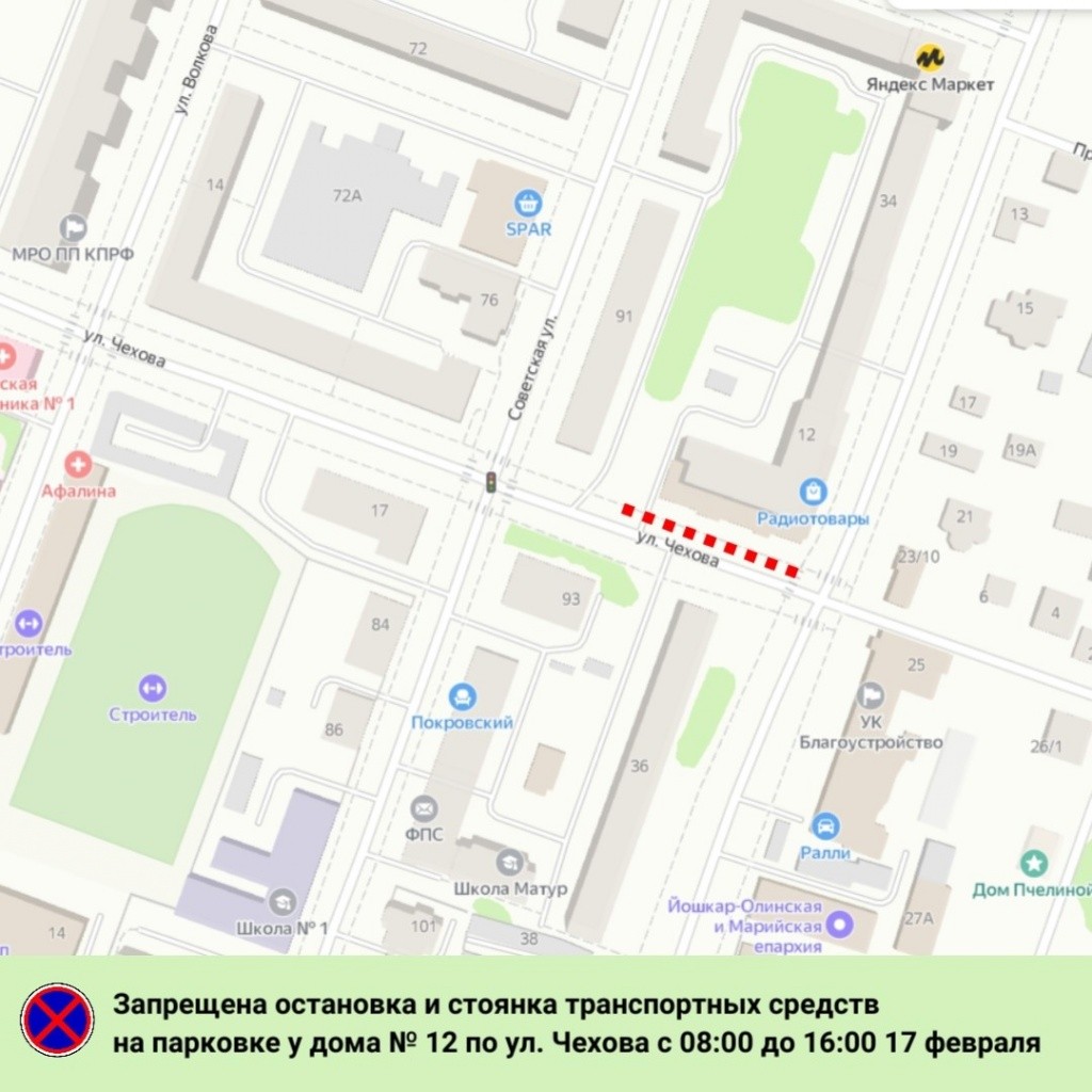 В администрации Йошкар-Олы предупредили о «снежной работе» у дома на улице Чехова и попросили водителей временно не парковаться у него.