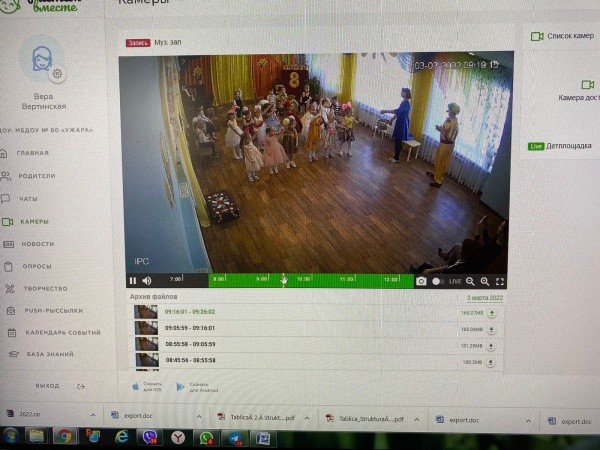 В музыкальном и спортивных залах детского сада, а также во внутреннем дворике установили камеры видеонаблюдения для онлайн трансляций занятий, праздников и развлечений, а в тёплое время года - общей утренней гимнастики и летних мероприятий. Родители малышей из детского сада "Ужара" уже смогли оценить возможности онлайн-сервиса. Благодаря ему они виртуально смогли побывать на утренниках, посвященных 8 марта.