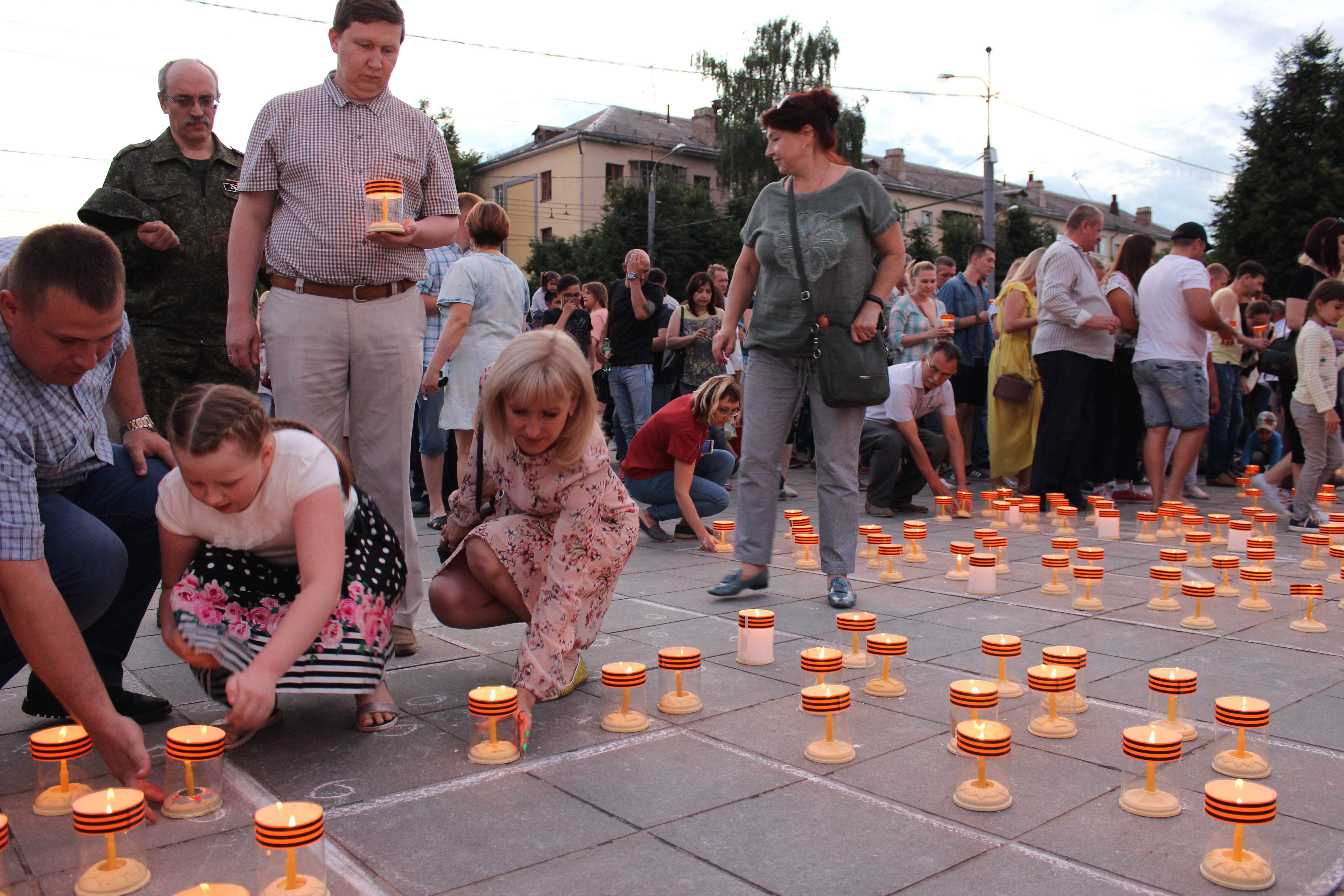 Именно здесь из сотен горящих свечей были выложены «Дорога памяти» и слово «Помним».