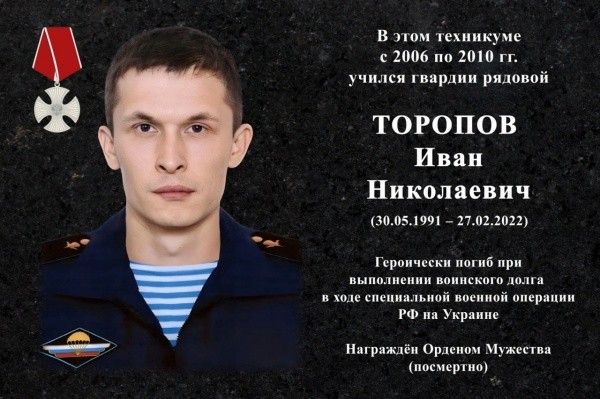 В Йошкар-Олинском строительном техникуме открыли мемориальную доску выпускнику  - гвардии рядовому Ивану Торопову.  Он героически погиб при выполнении боевых задач в ходе СВО.