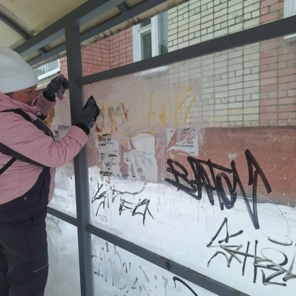 Работники АО «Город» в Йошкар-Оле борются не только со снегом, но и с последствиями вандализма. Основной проблемой стали бесконечные надписи на остановочных павильонах.