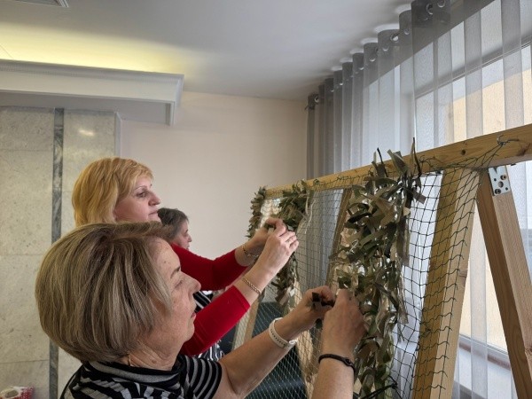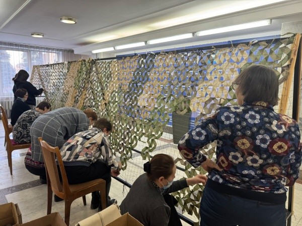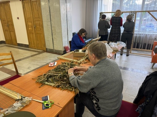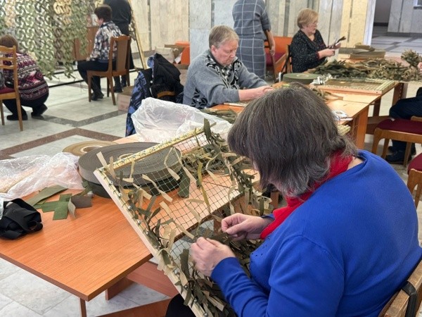 В мэрии Йошкар-Олы по вторникам и пятницам волонтёры плетут новые камуфляжные изделия – накидки для снайперов. Обучает их педагог из Норильска Виктория Осокина.