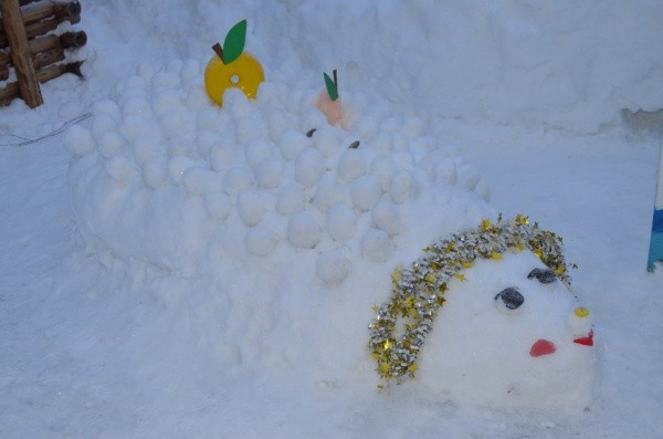 Порадовать малышей на прогулке решили педагоги и родители детского сада № 68 «Золотое петушок». Они  взялись за лопаты, скребки и краски и создали множество симпатичных фигур, которые сделали прогулки детей более интересными.