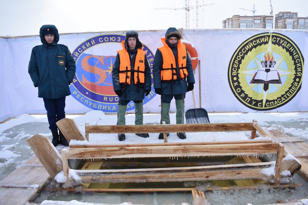Неподалеку от купели находится пара палаток для переодевания, еще одна − для тех, кто следит за безопасностью жителей Марий Эл. Тут же − машина бригады «скорой помощи». На мой взгляд, в этом году спасателей гораздо больше, нежели в прошлом − наверное, так кажется за счет волонтеров колледжа государственной и муниципальной службы, которые внимательно оценивают обстановку. Не раз они предлагали свою помощь тем, кто ненароком поскользнулся или не мог прийти в себя после окунания. Пригодилась она и женщине, решившей набрать воду из купели в пластиковые бутылки и не знавшей, как это сделать без вреда здоровью: ступеньки, ведущие к ней, застыли и скользили.