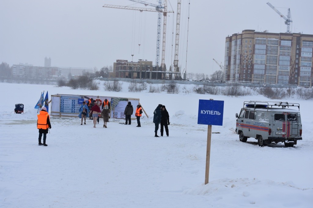 На левом берегу реки Малая Кокшага развернулся небольшой спасательный штаб, чтобы прийти на помощь участникам крещенских купаний. С ночи число желающих окунуться в студеную водицу по-прежнему велико.