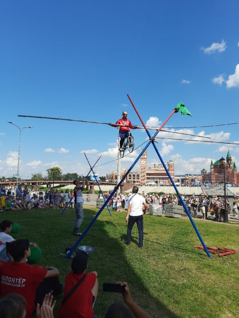 На Царьградской площади можно было полюбоваться выступлениями ансамбля канатоходцев «Росэкстрим» и марийских парашютистов. Во время получасового зрелища гости из Краснодарского края использовали разные атрибуты – эмалированные тазики (их применили как обувь для хождения по линии!), обруч (его канатоходец держал между ног, устремляясь вперед) и даже бутылку, на которой мастер продержался несколько секунд. Но больше всего поразило, как мужчина смог прокатиться по качающейся веревке на велосипеде, пройти с закрытыми глазами с кинжалом в зубах, а также остановиться на середине пути, чтобы встать на маленькую лестницу! Участник «Минуты славы», лучший канатоходец России Эдуард Мустафаев без заминки исполнил все трюки, чем бесповоротно влюбил в себя зрителей.