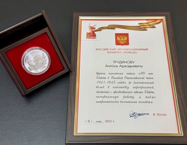 Награда присуждена врио мэра столицы Марий Эл Антону Трудинову «за значительный вклад в подготовку мероприятий, связанных с празднованием юбилея Победы, мемориальную работу, а также патриотическое воспитание молодежи». Врио мэра Йошкар-Олы отмечает, что он воспринимает эту награду как признание совместного труда всех жителей города, а также всеобщего единения и глубокого уважения к подвигу нашего народа и великой истории всей страны.
