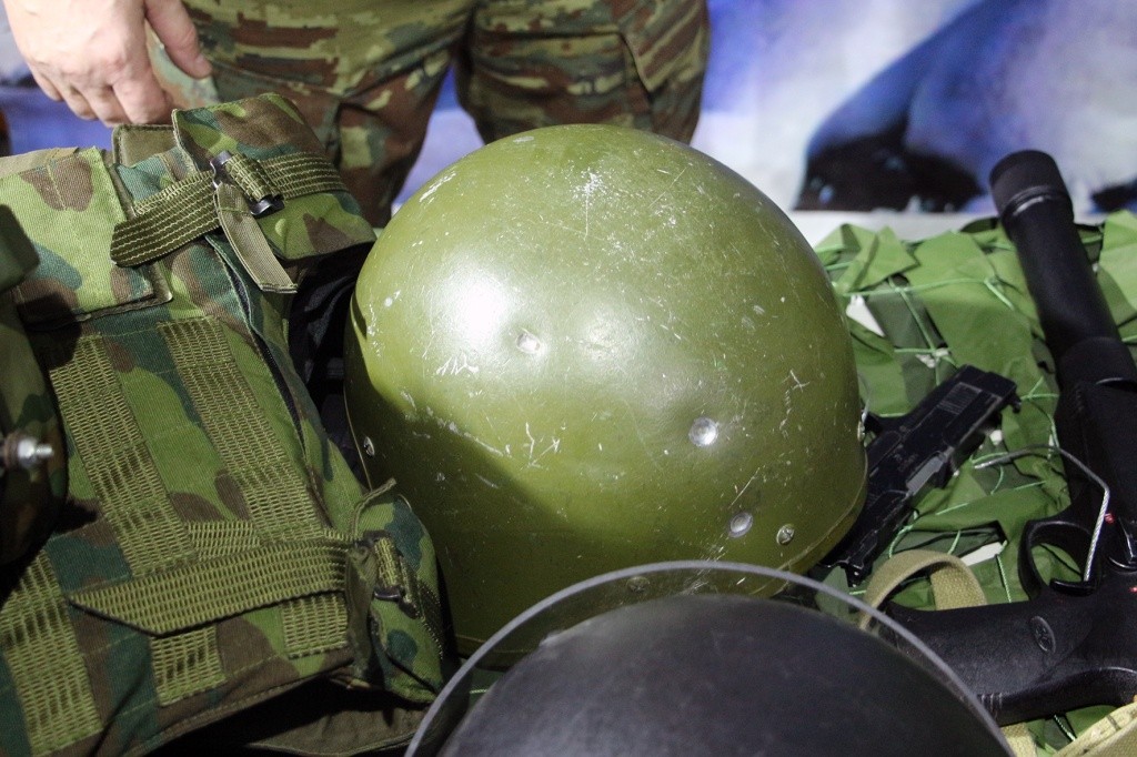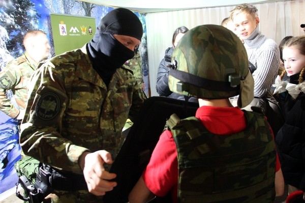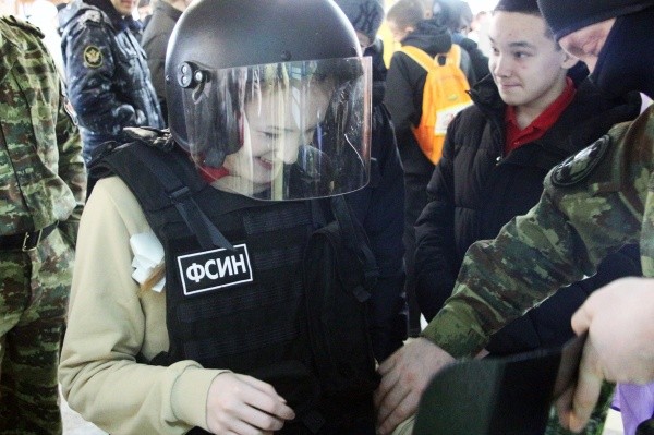 Но какой боец без надежного снаряжения? Юноши, как и, впрочем, девушки, не смогли себе отказать в примерке боевой экипировки сотрудника элитного отряда специального назначения. Специалист по данному направлению рассказал ребятам, что выбор комплекта обмундирования, в первую очередь, зависит от поставленной задачи. Например, вес более защищённого снаряжения бойца для выполнения специальных операций вместе с оружием может достигать 30 килограммов! Желающие смогли убедиться в этом лично, примерив экипировку. А венчает весь комплект образец конструкторского мастерства — шлем весом порядка 2 килограммов, который способен защитить голову носителя от выстрела из пистолета.