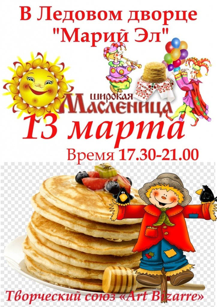 13 марта с 17.30 в Ледовом дворце жителей и гостей марийской столицы ожидают программа творческого союза «Аrt Вizarre», которая пройдет в фойе. Не обойдется без сеансов массового катания на коньках, а также угощения блинами. Как сообщили организаторы, шоу продлится до 21.00.