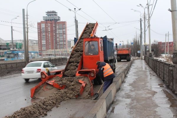 Коммунальные службы города вышли на очистку Центрального моста Йошкар-Олы. Проезжую часть очищают от грязи и снега.