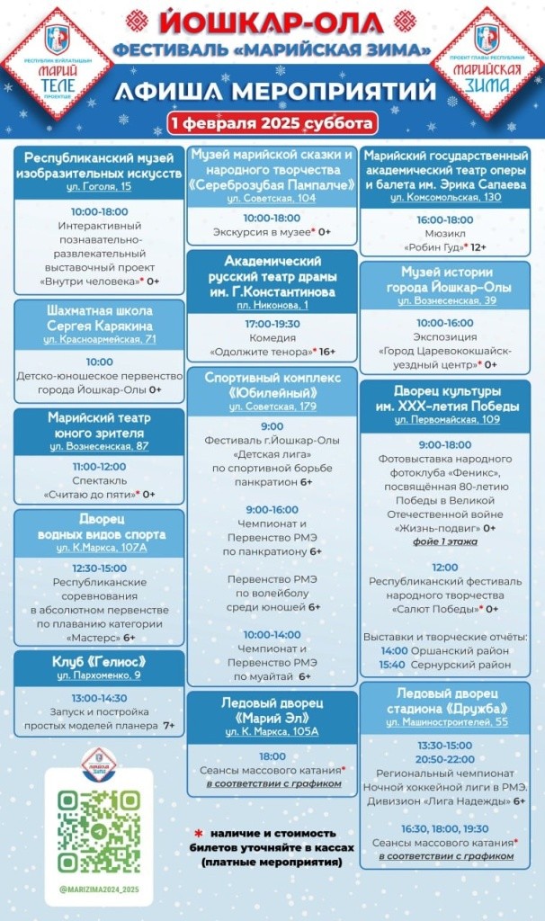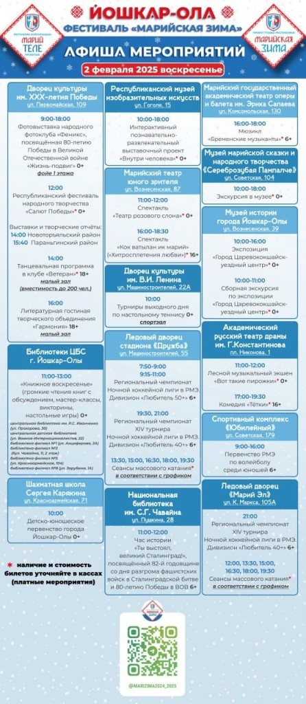 Администрация Йошкар-Олы опубликовала программу мероприятий «Марийская зима» на эти выходные. В их числе – спортивные события и театральные постановки, фотовыставки и экскурсии.