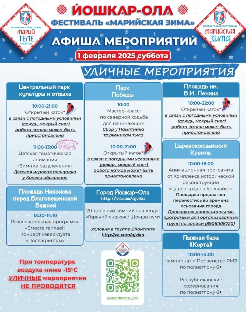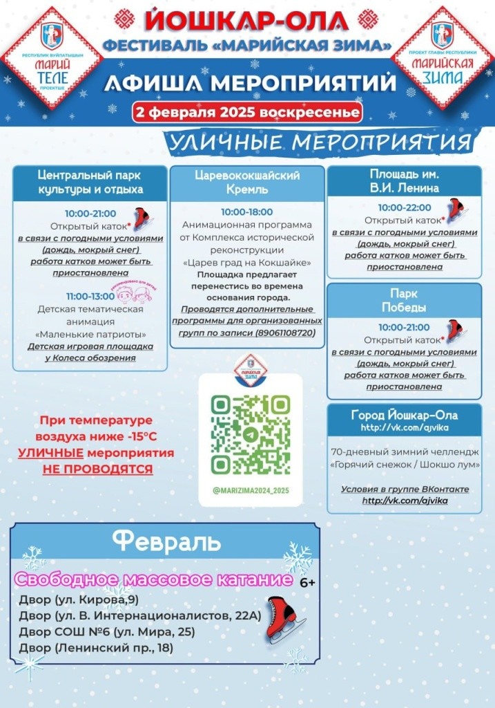 Фестиваль «Марийская зима» проводится по инициативе Главы Марий Эл. Мероприятия программы понравятся как детям, так и взрослым, и даже погода не станет помехой любителям активного или спокойного отдыха!