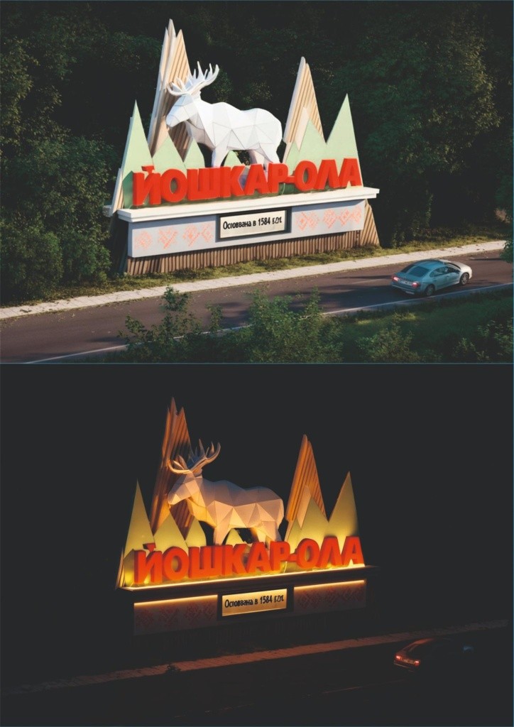 Победителем стало изображение лося, получившее 437 голосов. Авторы этого эскиза выбрали для стелы лося, который является историческим и официальным символом столицы республики. Красный цвет выбран в связи с тем, что «Йошкар-Ола» переводится с марийского как «Красный город». А название города использует оригинальный шрифт с сохранившейся стелы на Сернурском тракте.