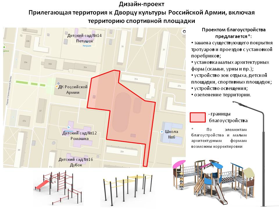 Известно, что в смету вошли работы по устройству тротуаров, резинового и грунтового покрытий, установке бортовых камней, демонтаж старых малых архитектурных форм и установка новых, в том числе урнами и скамейками. Территория будет оборудована башней с лестницей и горкой, башней со скалодромом, бревенчатым мостиком, канатами и спортивной стенкой, скамьей для пресса, комплексами из турников, шведской стенки и рукохода, гимнастических колец, брусьев, а также стойками для баскетбольной и волейбольной площадок, препятствиями «Лабиринт», «Разрушенный мост», «Разрушенная лестница», «Стенка с двумя проломами» и «Забор с наклонной доской». Появится хоккейная коробка. В завершение рабочие выполнят устройство освещения и озеленят участок.