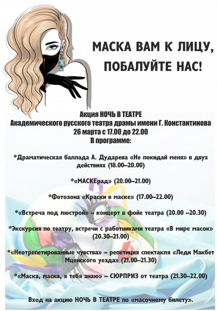 В современных реалиях маска в театре выглядит не столько загадочно, сколько защищающе. Руководство Академического русского театра драмы им. Г.Константинова пошло дальше и придумало новый формат мероприятий акции «Ночь в театре», где этот атрибут исполняет не только эти функции…